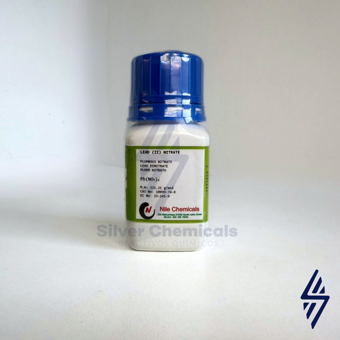 Es una sal cristalina de fórmula Pb(NO₃)₂, altamente soluble en agua y de aspecto blanco o incoloro. Se emplea en laboratorios para la preparación de otros compuestos de plomo, en análisis cualitativo (por ejemplo, para detección de haluros o sulfuros), y en la fabricación de pigmentos y explosivos. Es un oxidante fuerte y debe mantenerse alejado de materiales orgánicos o reductores. En solución acuosa, libera iones Pb²⁺ y NO₃⁻, lo que le confiere reactividad química significativa.